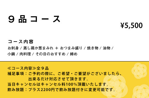 旬を味わえるコース料理が飲み放題込みで5500円~(全6品)お食事のみのコースは3300円~。お一人様からOKです!飲み放題は120分(L.O90分)。この辺では珍しい、日本酒の飲み放題もOKなのでコスパ◎最大座敷20名様まで可能です。ゆっくり足を伸ばせる掘りごたつ式ですよ。是非ご利用くださいね。